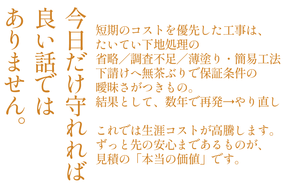 だからこそ私たちは、現場で磨いた確かな技術と、誠実なヒアリング・わかりやすい説明・責任あるアフターケアを徹底します。